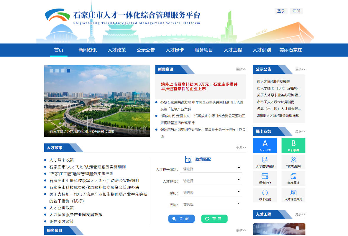 石家庄人才绿卡分为市级A卡、B卡和县(市、区)卡,相关人才政策可在石家庄市人才一体化综合管理服务平台—人才政策查看